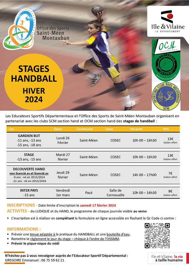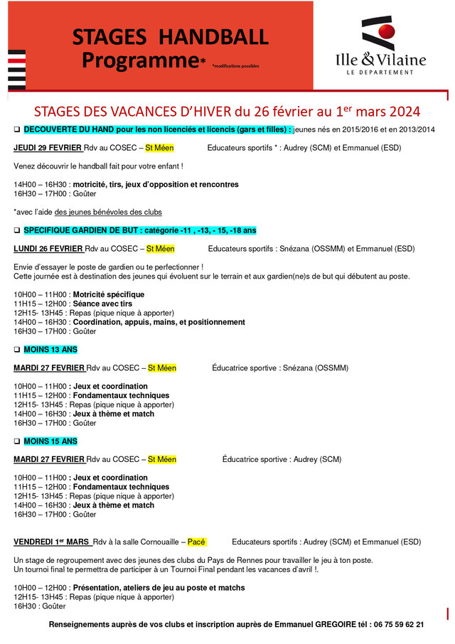 Pendant les vacances de février, le club en partenariat avec l’office des sports Saint-Méen Montauban propose un stage de handball ! Le programme et toutes informations tarifaires sont disponibles sur la publication.