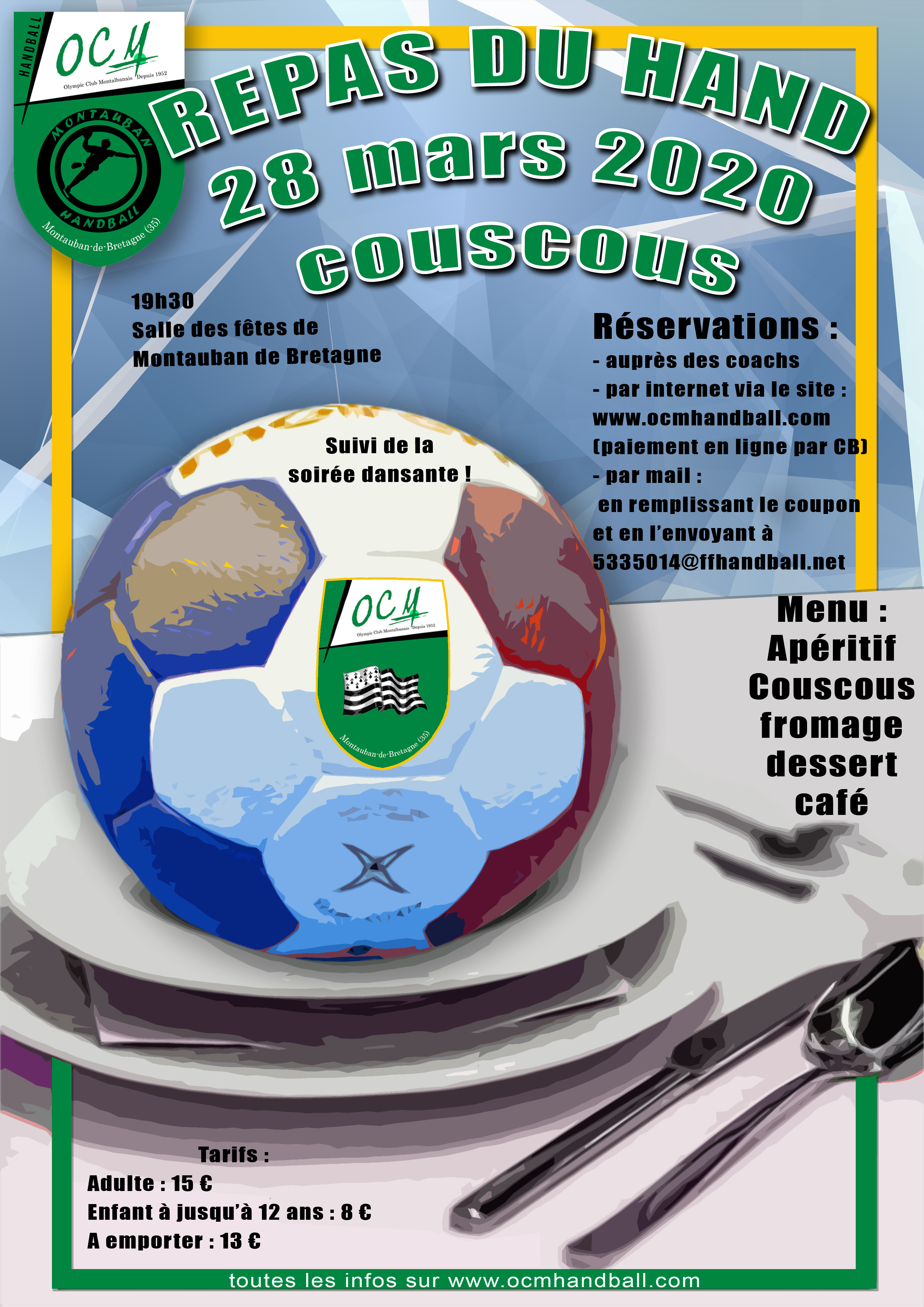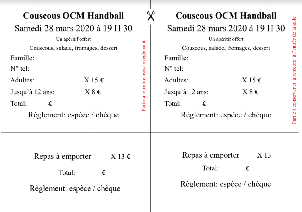 Les réservations pour le repas du hand du samedi 28 03 2020 sont ouvertes. Vous pouvez réserver en ligne avec paiement par CB sur la billetterie du club. (sur le lien ici – réservation et paiement en ligne repas du hand). Il faut réserver dès que possible – Nombre de places limité et fin des réservations le 20 mars à 20h00 La réservation auprès des coachs sera possible à partir du 2 mars avec le coupon à télécharger (en cliquant dessus) a remplir et à remettre aux coachs accompagné de votre règlement
