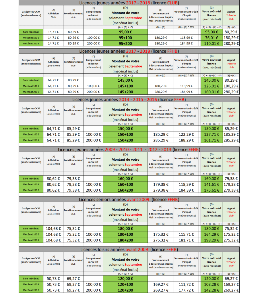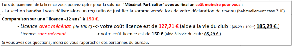 Coût de la licence possibilité avec ou sans mécénat (voir tableau comparatif en fin de page)